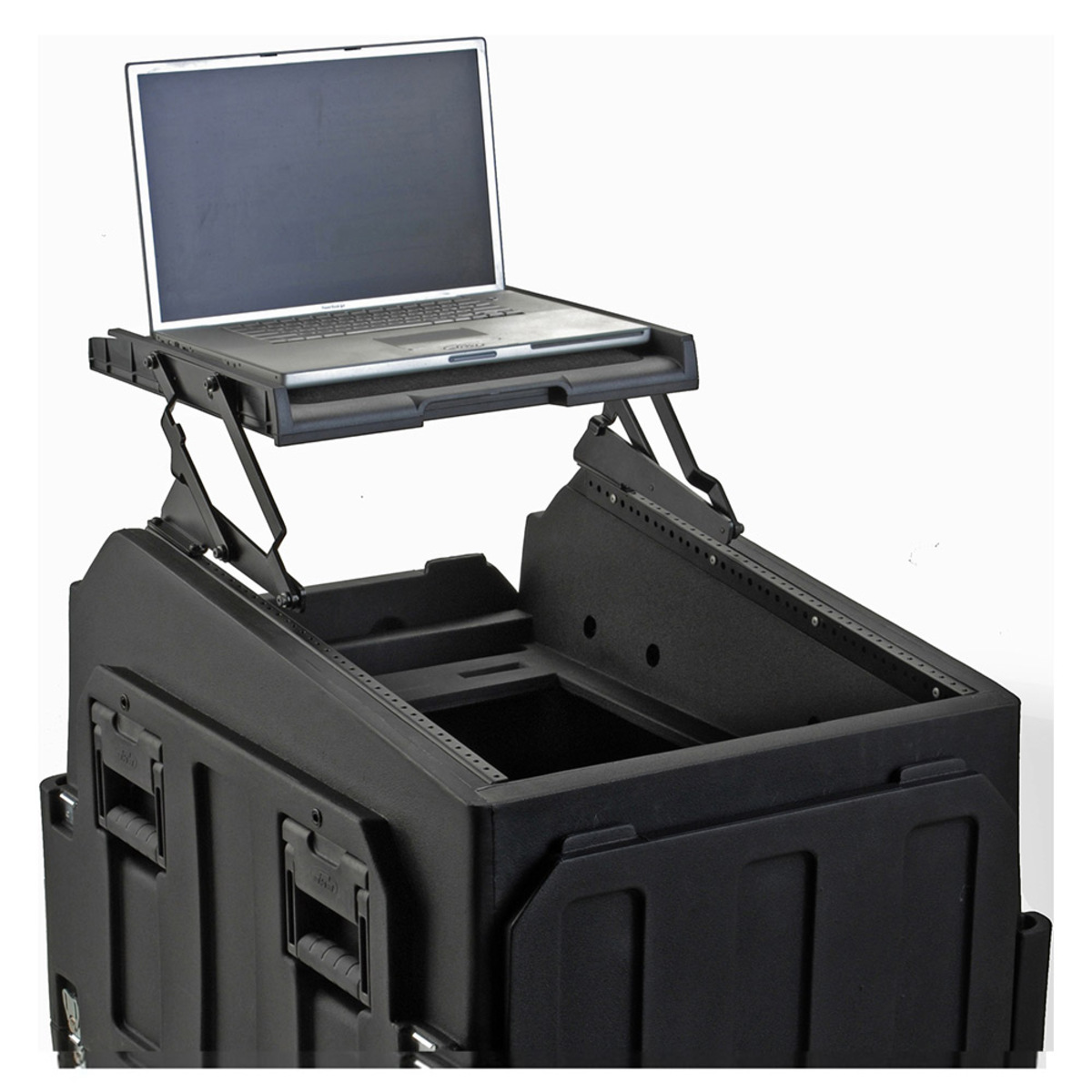 The 1SKB-AV14 is a uniquely designed scissor hinged shelf that puts a shelf just where it is needed. The hook and loop surface of the A/V shelf is ideal for laptop computers, projectors, or monitors. The scissor design allows the shelf to remain connected to the Mighty GigRig (1SKB19-R1406) or Gig Safe (1SKB19-R1400) while the lid is closed. The steel arms only require 2U of rack space for secure mounting.