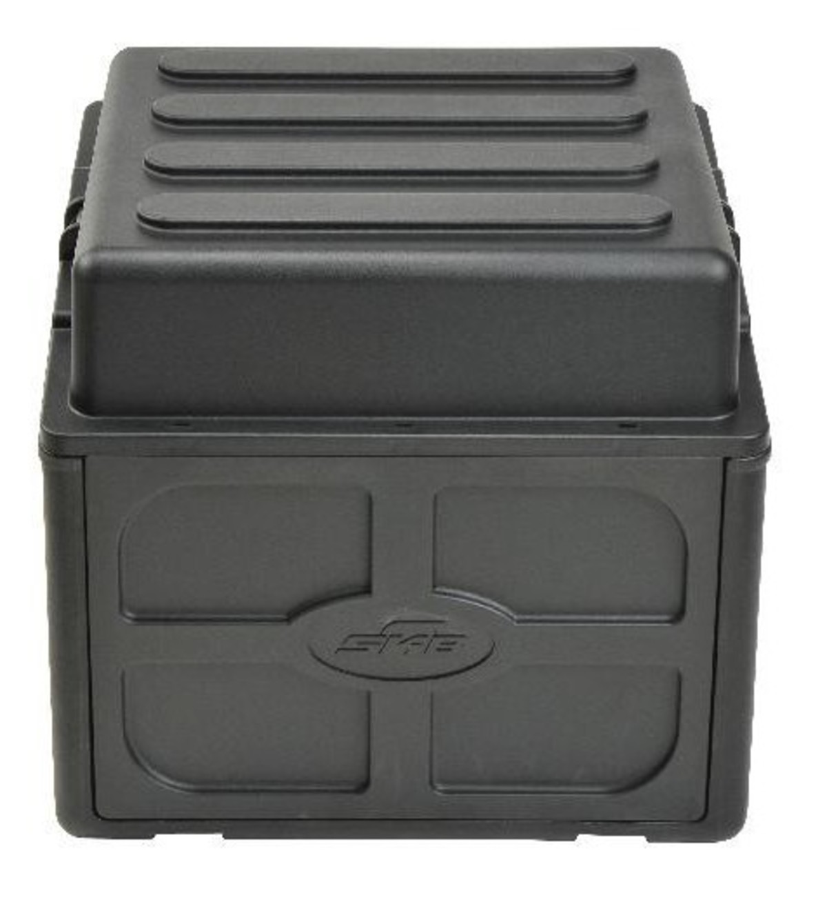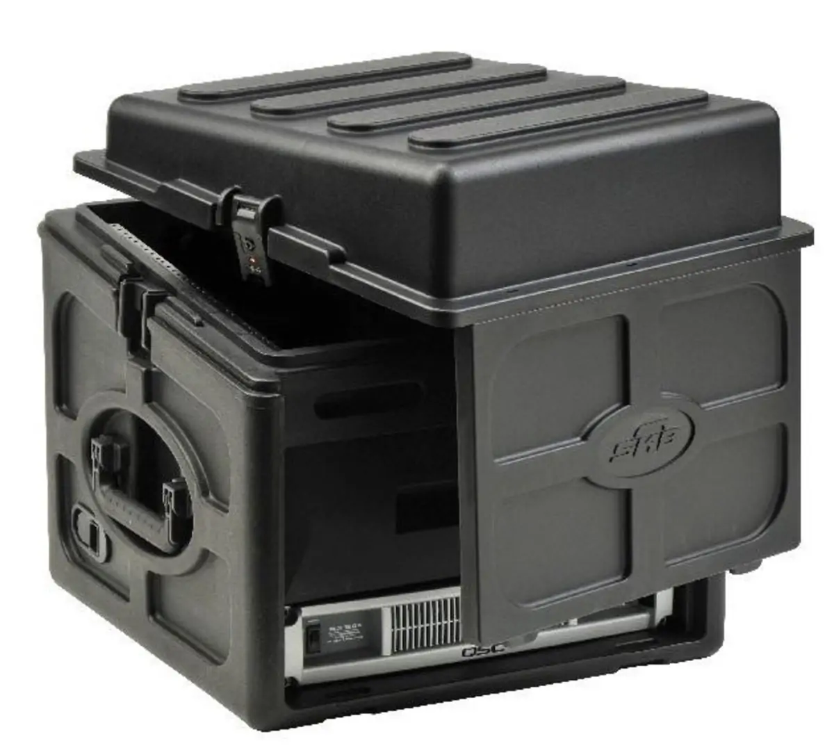 The 1SKB-R106 is a 10U slanted top and 6U front, rack case that feaatures steel threaded rails, hard lid and doors, side access ports (for cable routing) and has enough space to mount the new 1SKB0-AV8 Retractble Shelf. The one piece base is roto-molded of Linear Medium Density Polyethylene (LMDPE) while the hard front and rear doors and lid are Injection molded of Rubber Modified Styrene (RMS).