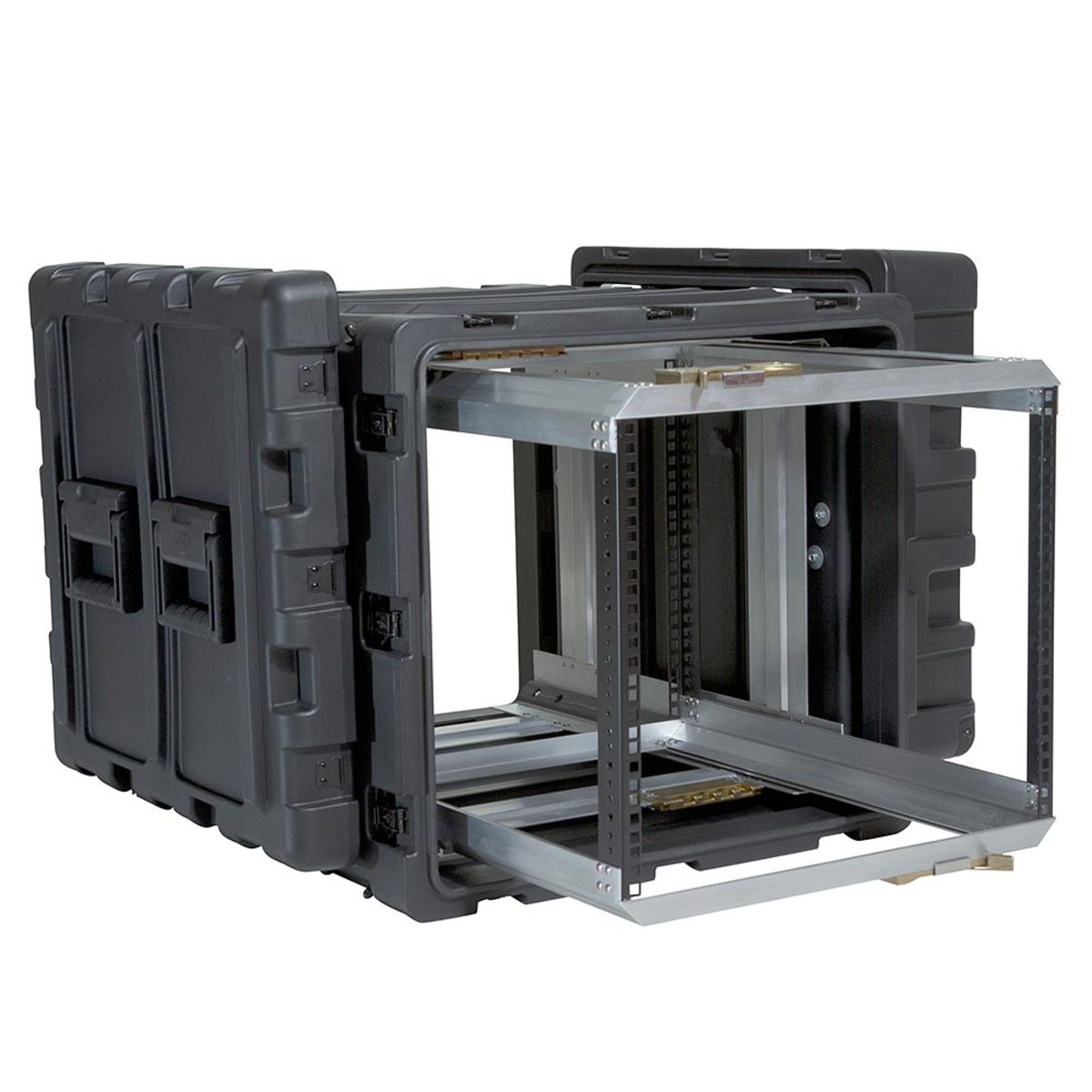 The SKB 3RR-9U24-25B 9U rack case represents the pinnacle of our rack cases. These IP67 shock rack cases are tougher, lighter, stronger and better than any other rack case out there in the market. The removable rack option saves time and money by eliminating the hassle of dealing with cables and screws in small, limited spaces—just take the rack out, change the equipment, and slide the rack in again.