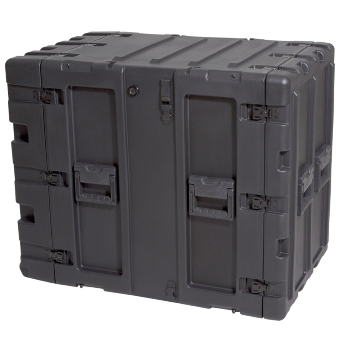 Molded of LMDP Linear Medium Density Polyethylene plastic that meets or exceed MIL-STD 810G standards. The rugged roto-molded shell ensures industry leading strength and impact resistance. The standard COTS (commercial off the shelf) case comes with a 2” deep front lid and a 5” deep rear lid to accommodate rack gear that is longer than 24”, and edge casters to allow convenient case transport. Molded-in stacking ribs and lugs are designed to stack with competitive manufacturers cases. Black powder coated stainless steel hardware are recessed for protection is standard as well as 8 comfort grip spring loaded lift handles which allow for easy movement. An automatic pressure relief valve is another standard feature along with gasket sealed lids that include convenient lid hangers to store your lids when your equipment is in operation. Coupling straps are included for securing the racks together when stacked.
